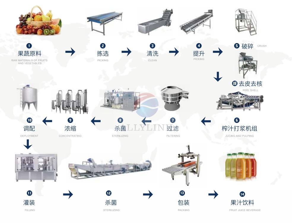 果汁、果醋類飲料生產由許多設備組成生產線,加工各種果汁果醋類飲料,包括打漿機、榨汁機、發(fā)酵系統(tǒng)、過濾器、水處理設備、沖瓶機、灌裝機、封口機、殺菌設備、CIP就地清洗機、過濾設備、包裝設備等等。